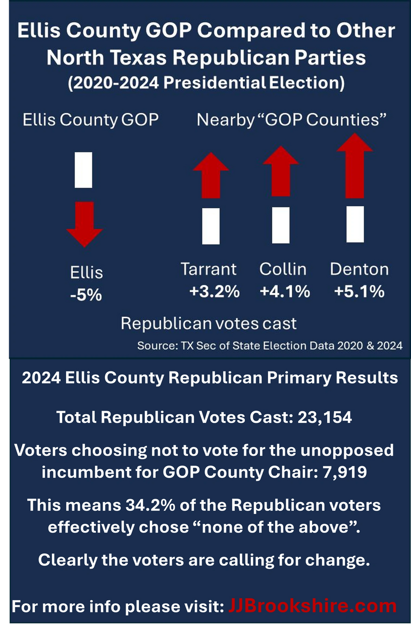 For the past nine years, I have listened to Ellis County voters express concerns about the disunity among Republican voters and the local GOP heading in the wrong direction. This is reflected in voting trends from the last three Presidential elections where the percentage of Democrat voters grew nearly 7%. Compared to Denton, Collin, and Tarrant counties, only Ellis lost ground to Democrats from 2020 to 2024.